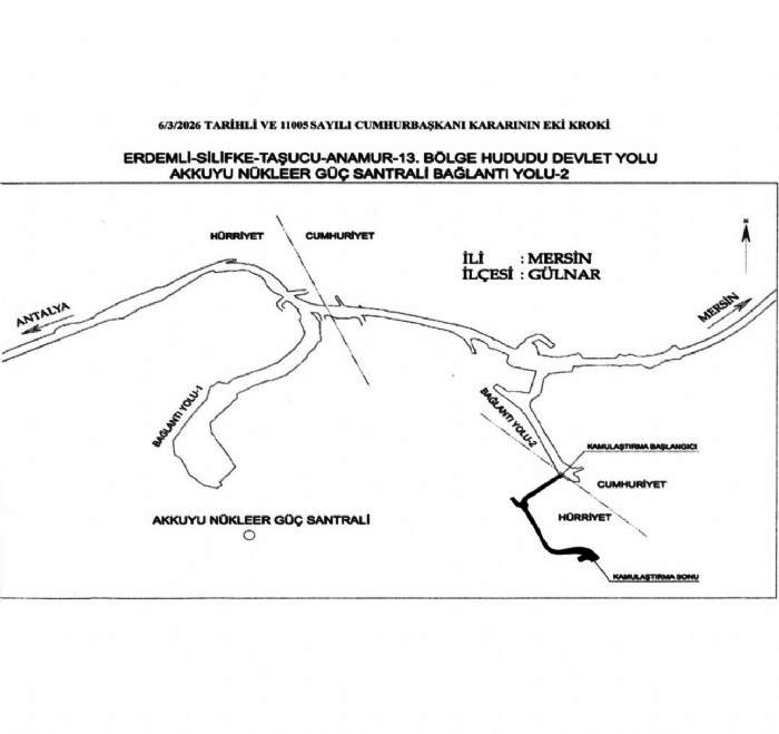 Karara göre, Erdemli-Silifke-Taşucu-Anamur 13. Bölge Hududu Devlet Yolu Akkuyu Nükleer Güç Santrali Bağlantı Yolu-2 Projesi kapsamında belirlenen güzergâhta kalan taşınmazlar ve üzerlerindeki müştemilatlar, yol yapım çalışmalarının hızlandırılması amacıyla Karayolları Genel Müdürlüğü tarafından acele kamulaştırılacak.