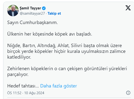 Türkiye’nin farklı yerlerinden gelen hayvan cesedi ve hayvanların öldürülme görüntüleri sosyal medyada ve vatandaşın vicdanında kanlar akıtırken toplumun farklı kesimlerinden de isyan sesleri yükseliyor. Eski AKParti Gaziantep Milletvekili Şamil Tayyar, resmi X hesabından yaptığı paylaşımda kamuoyuna yansıyan görüntülerle ilgili AKP’li Cumhurbaşkanı Erdoğan’a bir çağrıda bulundu.