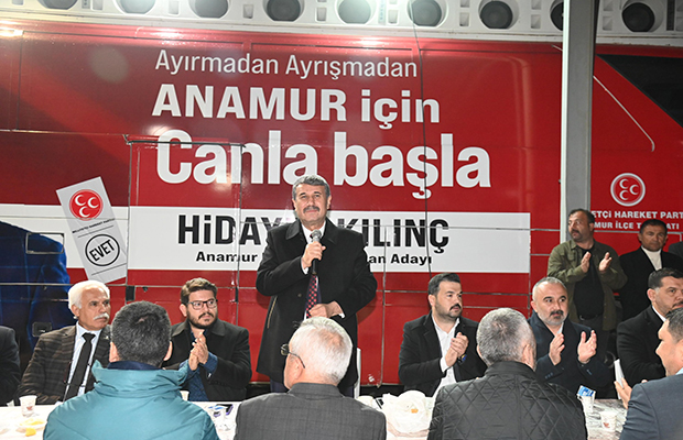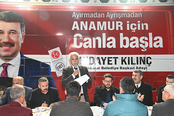 MHP ve AK Parti başkan ve temsilcilerinin konuşmasının ardından söz alan belediye Başkanı Hidayet Kılınç, 5 yıl boyunca yaptığı hizmetleri sıraladı ve bundan sonra yapacağı 5 yıllık hizmet projelerini anlattı. MHP ve AK Partili gençler tarafından ‘Başkan Hidayet Anamur vilayet, dik dur eğilme, Anamur seninle sloganları ile sözleri sık sık kesilen Başkan Hidayet Kılınç, “Gençler bende sizinleyim.” Diyerek teşekkür etti.
