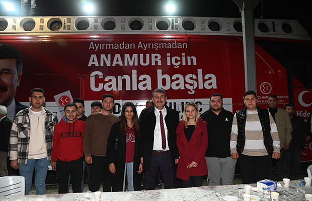 MHP ve AK Parti başkan ve temsilcilerinin konuşmasının ardından söz alan belediye Başkanı Hidayet Kılınç, 5 yıl boyunca yaptığı hizmetleri sıraladı ve bundan sonra yapacağı 5 yıllık hizmet projelerini anlattı. MHP ve AK Partili gençler tarafından ‘Başkan Hidayet Anamur vilayet, dik dur eğilme, Anamur seninle sloganları ile sözleri sık sık kesilen Başkan Hidayet Kılınç, “Gençler bende sizinleyim.” Diyerek teşekkür etti.