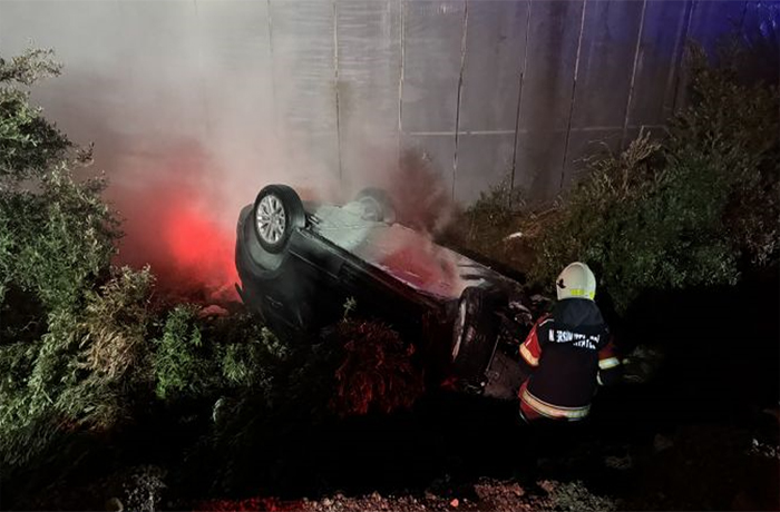 Kontrolden çıkan araç önce ilçe giriş levhasına, ardından otobüs durağına çarptı. Çarpmanın etkisiyle yaklaşık 3 metre aşağıya doğru sürüklenen otomobil, bir seraya çarpıp zeytin ağaçlarının altında takla atarak ters şekilde durabildi.