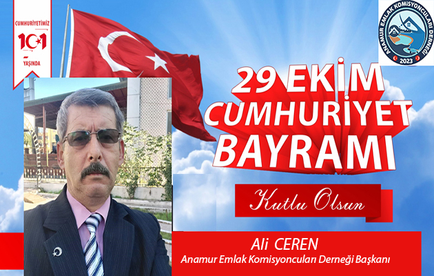 Cumhuriyetin 102. kuruluş yıl dönümü dolayısıyla bir mesaj yayımlayan Anamur Emlak Komisyoncuları Derneği Başkanı Ali Ceren, “Cumhuriyetimize sahip çıkmak, ülkemizin ve milletimizin geleceği için çalışmak, mücadele etmek ve gerektiğinde fedakarlıkta bulunmak hepimizin görevidir” dedi.