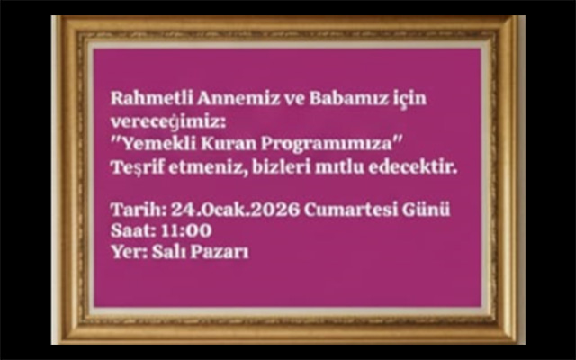 Anamur’lu Dr. Nizamoğlu Ali Uysal, vefat eden annesi ve babası için 24 Ocak Cumartesi günü saat 11.00’de, Salı Pazarı’nda Kur’an-ı Kerim Tilaveti okutacaktır.