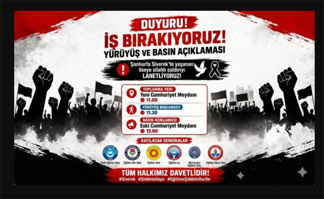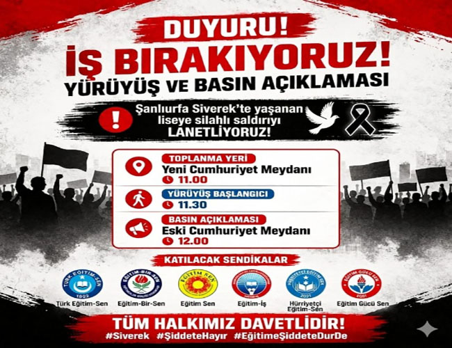 Anamur’da örgütlü olan Türk Eğitim-Sen, Eğitim-Bir-Sen, Eğitim Sen, Eğitim-İş, Hürriyetçi Eğitim-Sen ve Eğitimin Gücü-Sen; Şanlıurfa Siverek’te yaşanan liseye silahlı saldırıya tepki göstermek için bir araya gelerek İş Bırakma, Yürüyüş ve Basın Açıklaması yapacaklar.
