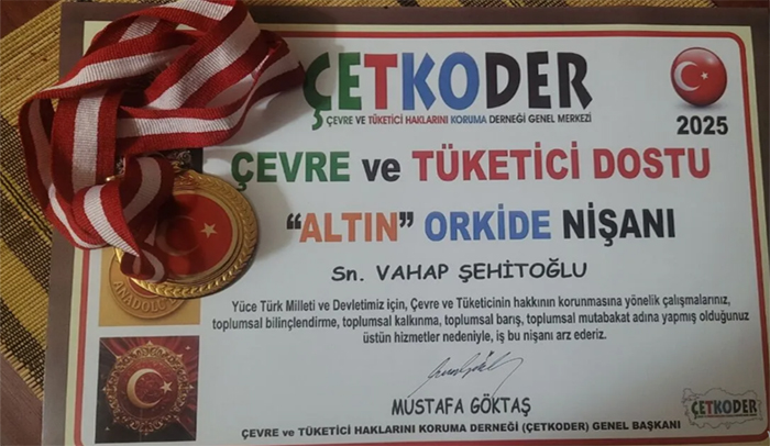 Bu anlamlı törende, çevre ve tüketici dostu çalışmalarıyla öne çıkan Mersin İnternet Gazetecileri Cemiyeti (MEİGDER) Başkanı ve Sonses.tv Genel Yayın Yönetmeni A.Vahap Şehitoğlu’na “Altın Orkide Nişanı” takdim edildi.