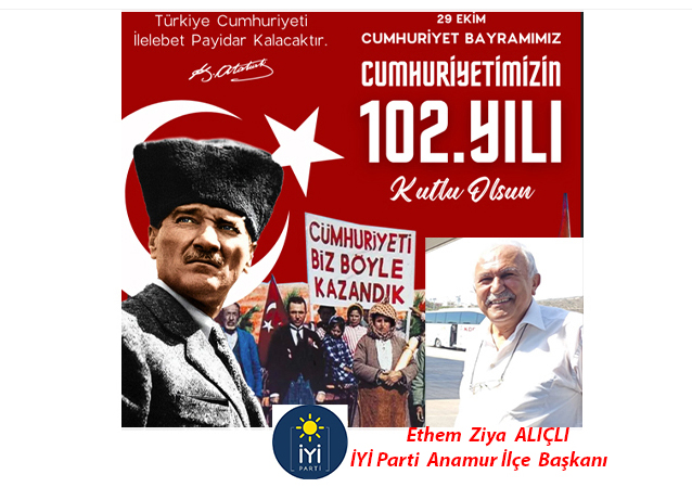 İYİ Parti Anamur İlçe Başkanı Ethem Ziya Alıçlı, Cumhuriyetin 102. kuruluş yıl dönümü dolayısıyla bir kutlama mesajı yayımladı.