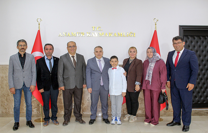 Milli Eğitim Bakanlığı Temel Eğitim Genel Müdürlüğü tarafından düzenlenen “Köklü Geçmişten Güçlü Cumhuriyete” konulu ilkokullar arası resim yarışmasında Türkiye üçüncüsü olan Anamur Şehit Hasan Kuş İlkokulu ve Anamur Bilim ve Sanat Merkezi öğrencisi Altuğ Tel, Anamur Kaymakamımız Kemal Duru’yu makamında ziyaret etti.