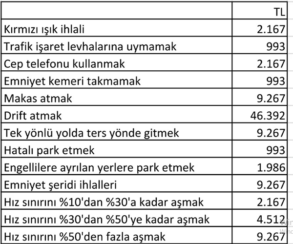 Zamlı rakamlara göre yeni yılda kırmızı ışıkta geçmenin veya cep telefonuyla konuşmanın cezası 2 bin 167 liraya yükselecek. Trafik magandalarının muhatıp olduğu makas atmanın cezası 9 bin 267 liraya yükselirken drift atmak ise 46 bin 392 lira oldu.