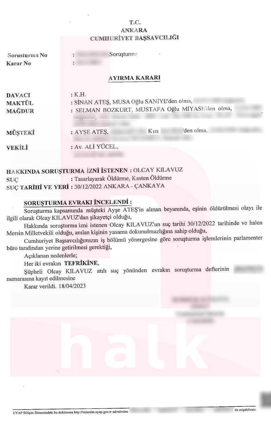 Olcay Kılavuz’un eşi Kadriye Kılavuz eşinin yurtdışına kaçtığı iddialarını yalanladı. Kılavuz hakkında, “tasarlayarak öldürme” ve “kasten öldürme” suçundan işlem başlatıldı ve soruşturma izni istendi.