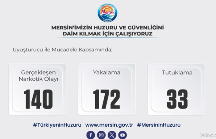 Mersin’de son bir ayda düzenlenen narkotik operasyonlarında 172 şüpheli yakalanırken, 33 şahıs tutuklanarak cezaevine gönderildi.