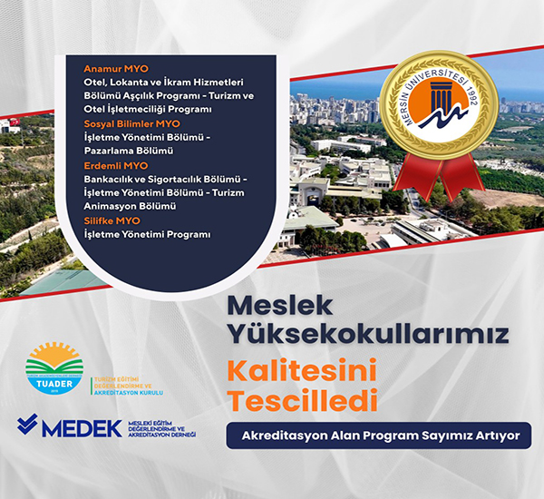 Mersin Üniversitesi, Yükseköğretim Kalite Kurulu (YÖKAK) vizyonu çerçevesinde yürüttüğü kalite çalışmalarının somut sonuçlarını toplamaya devam ediyor. Eğitimde niteliği artırmak ve öğrencilerine dünya standartlarında bir eğitim sunmak amacıyla yapılan çalışmalar neticesinde; Anamur, Silifke, Sosyal Bilimler ve Erdemli Meslek Yüksekokullarında yer alan programlar, Turizm Eğitimi Değerlendirme ve Akreditasyon Kurulu (TURAK) ve Mesleki Eğitim Değerlendirme ve Akreditasyon Derneği (MEDEK) tarafından akredite edilerek eğitim kalitelerini tescilledi.