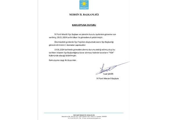İYİ Parti Mersin İl Başkanlığından yapılan açıklamada; Mezitli ilçe Teşkilatının 19.01.2024 tarihi itibari ile görevden el çektirildiği yazılı bir tebligat yapılarak duyuruldu. İYİ parti İlçe Yönetiminin Parti kararlarına uymadıkları ve emirleri dinlemedikleri de açıklandı. Erhan ANTALYALI Başkanlığındaki yönetimin tümü görevden alındı. İlçe Başkanı Ertan ANTALYALI’nın karar defterini parti teşkilatından alarak vermediği, bu konuda yasal yollara başvurulacağı da açıklandı. İYİ parti Mersin İl Başkanlığının ilgili yazısında 19.04.2024 tarihi itibari ile ilçe yönetiminin görevden alındığı, bu tarih ve bundan sonra almış oduğu hiçbir kararın da geçerli olmadığı da açıklandı. Mersin İl Başkanlığının konuyla ilgili yaptığı yazışmalar ilişikte yer almaktadır. Basınımıza ve kamuoyuna saygı ile duyurulur.