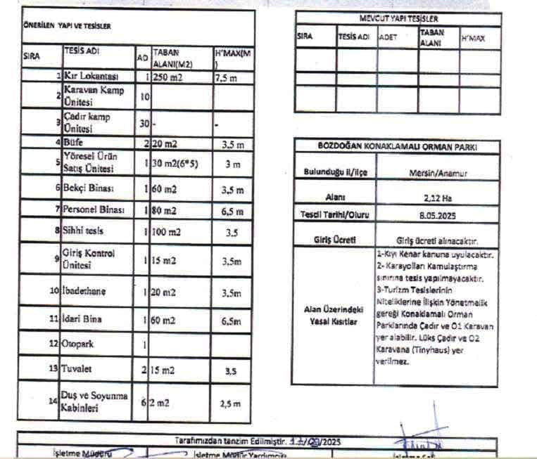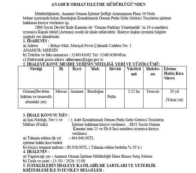 Mersin’in Anamur ilçesinde Bozdoğan sahilinde yer alan 20 bin m2’den büyük orman arazisi Konaklamalı Orman Parkı olarak 20 yıllığına ihaleye çıkarılıyor. Toplam 650 m2’den fazla yapılaşma içeren proje kapsamında restoran, büfe, bekçi ve personel binaları ile sıhhi tesis, idari bina, ibadethane, yöresel ürün satış üniteleri inşa edilecek. Çadır ve karavan kamp alanlarını da içeren Bozdoğan Konaklamalı Orman Parkı’na giriş ise ücretli olacak. İlk yıl için 404 bin 640 TL kira bedeli belirlenen orman parkı ihalesi 13 Mart 2026 tarihinde Anamur Orman İşletme Müdürlüğü’nde yapılacak.