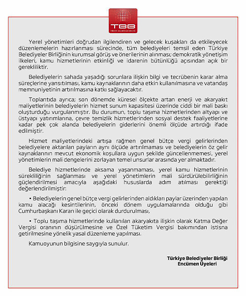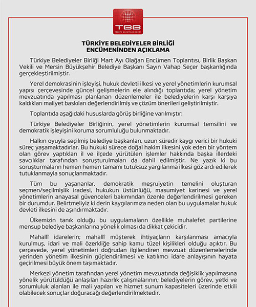 Türkiye Belediyeler Birliği Encümeni, Birlik Başkan Vekili ve Mersin Büyükşehir Belediye Başkanı Vahap Seçer başkanlığında Ankara’da gerçekleştirilen Mart Ayı Olağan Encümen Toplantısı’nın ardından yazılı açıklama yaptı. Açıklamada şu ifadelere yer verildi: