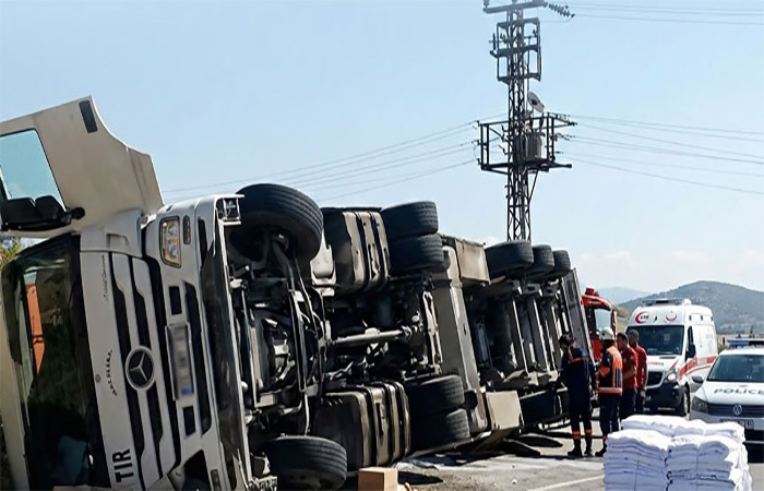 Antalya–Mersin D-400 karayolu Kaledran mevkiinde meydana gelen kazada virajı alamayan TIR yol kenarına devrildi.