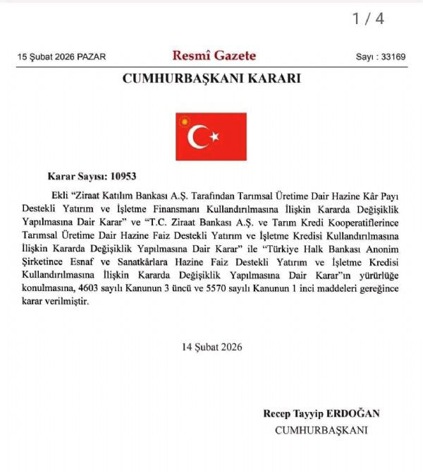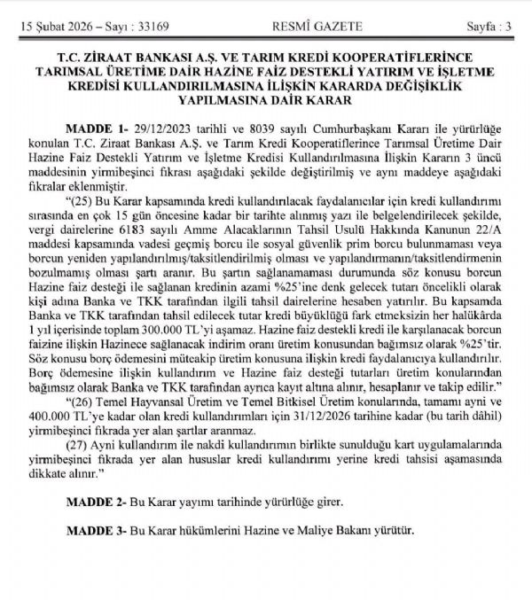 Resmî Gazete ’de yayımlanan Cumhurbaşkanı Kararı ile T.C. Ziraat Bankası A.Ş. ve Tarım Kredi Kooperatifleri aracılığıyla kullandırılan tarımsal üretim kredilerinde önemli bir değişikliğe gidildi. Karar kapsamında çiftçilerden talep edilen “SGK ve vergi borcu yoktur” yazısı şartı kaldırıldı.